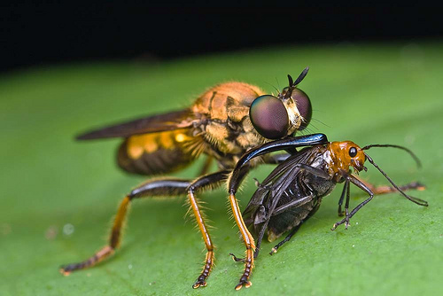 The Asilidae are the robber fly family. They are powerfully built, bristly flies with short, sharp, stout sucking mouthparts. The name "robber flies" reflects their notoriously aggressive predatory habits; they feed mainly on other insects and they largely wait in ambush and catch their prey in flight. The Asilidae are a family in the order Diptera, the true flies. The common name for members of the family is the robber flies.